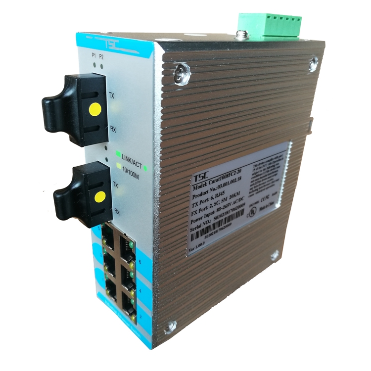 Carat10-6TX-2FS20 6个百兆电口,2个百兆光口(单模20KM,SC)卡轨式工业以太网交换机,85~265V AC/DC,防护等级IP40