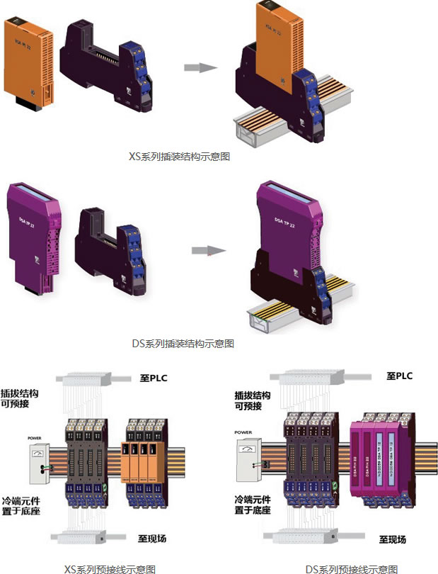 插装结构是小电气安装的传统方式,接线端子和表头分离,接线端 子功能固定,可互换表头。接线完成以后,换表维修可不用接线图,也不会再动接线端子。 可减轻接线,维护的工作量,特别是脑力负担。