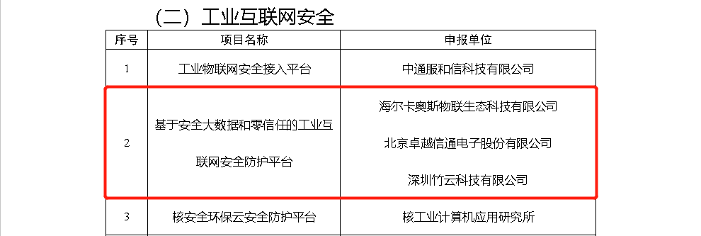 近日,工业和信息化部公布海尔卡奥斯物联生态科技有限公司、北京卓越信通电子股份有限公司、深圳竹云科技有限公司,共同合作的基于安全大数据和零信任的工业互联网安全防护平台,成功入选2020年网络安全技术应用试点示范名单。