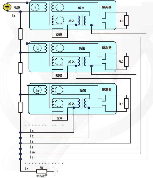 假设现场有100个4~20mA信号,如果信号都是20mA,100乘以20mA就是2A,如果100台表地线电阻为0.5Ω,地电位就上翘1V,这对于250Ω取样PLC卡件,影响是量程的25%,对于25Ω取样的PLC卡件来说,影响已达到量程的250%了。