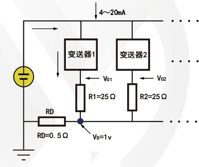 如果仪表的输入回路、输出回路都不使用隔离的电源会产生多大的地线误差电位?以下图进行说明。