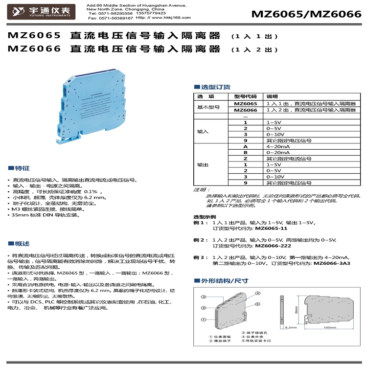 宇通MZ 6066-222直流电压隔离器MZ6066-3A3 0~10V 4~20mA