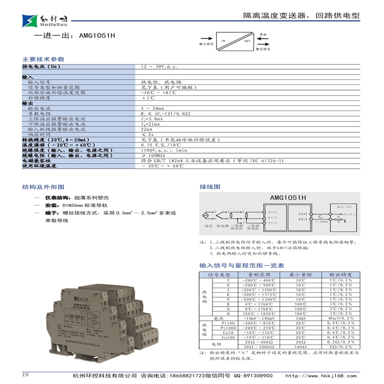 和利时AMG1051H温度隔离变送器 热电阻偶信号
