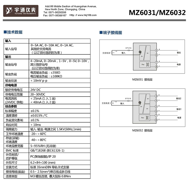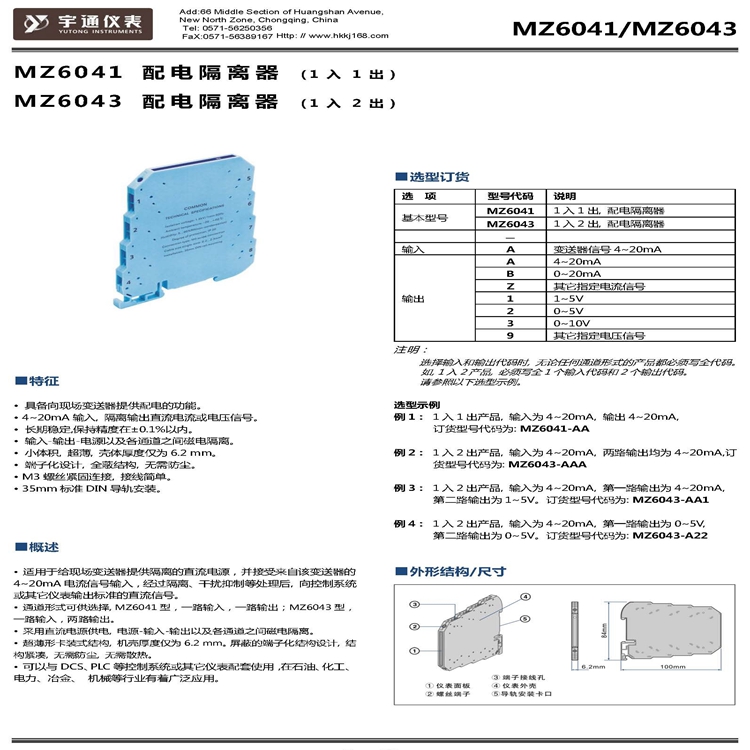 宇通MZ 6043-AAA信号隔离配电器1入2出4~20mA薄