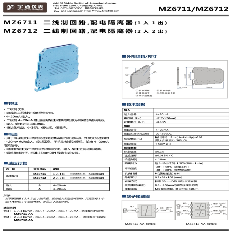 宇通MZ 6711-AA信号隔离配电器1入1出4~20mA回路供电