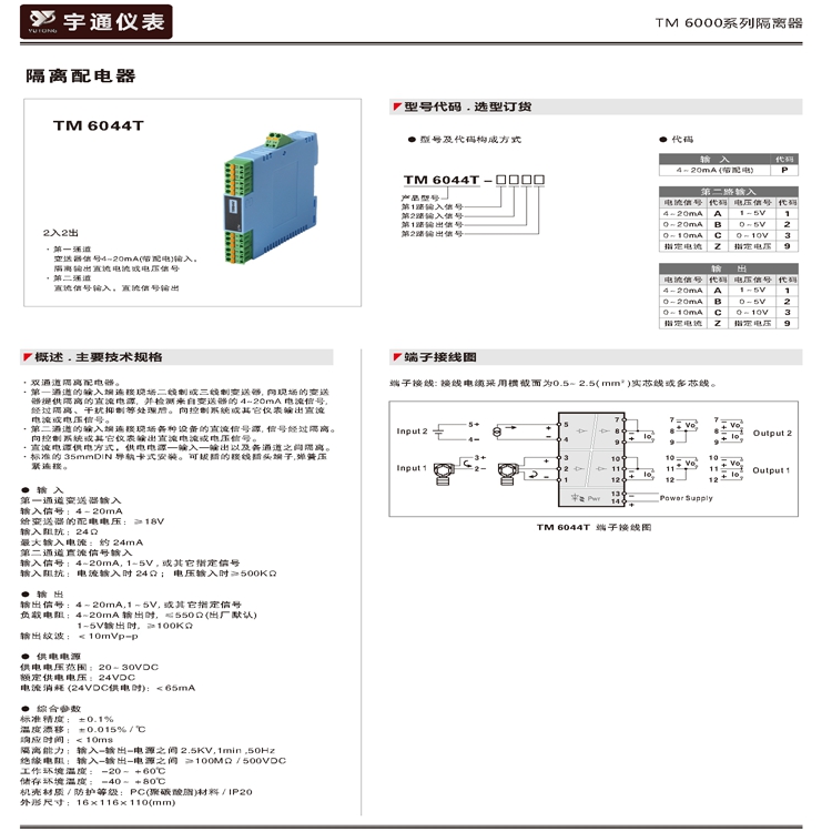 宇通TM 6044T-PPAA隔离配电器2入2出4~20mA回路供电