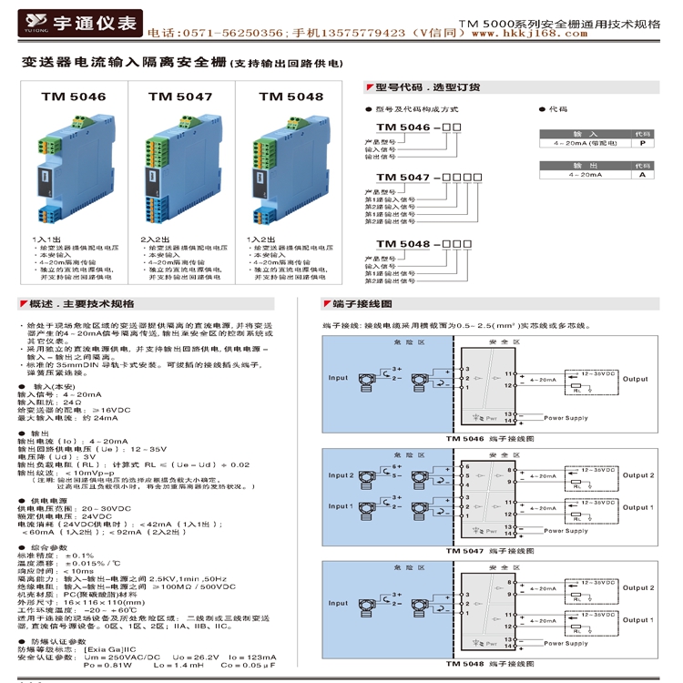 TM 5000 系列隔离安全栅是依据国家标准GB3836.1-2010《爆炸性环境 第1部分:设备 通用要求》、GB3836.4-2010《爆炸性环境 第4部分: 由本质安全型“ i ”保护的设备》设计的产品。是连接工业现场仪表与控制室仪表之间的本质安全关联设备。TM 5000系列产品具备多种类型规格可供选择,满足自控系统中各种信号的隔离、配电、转换、分配、报警设定等功能要求。广泛应用于工业过程控制中需要本质安全防爆的场合。。