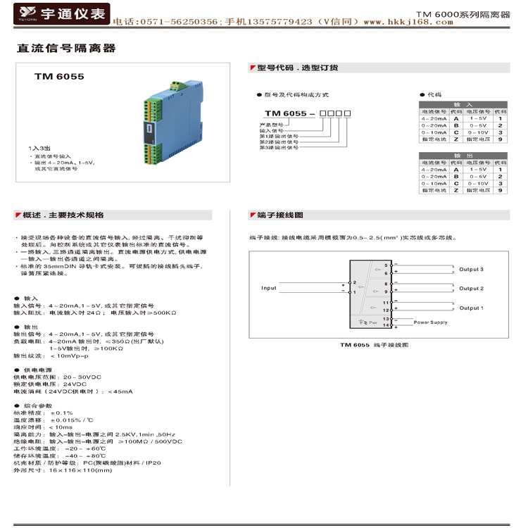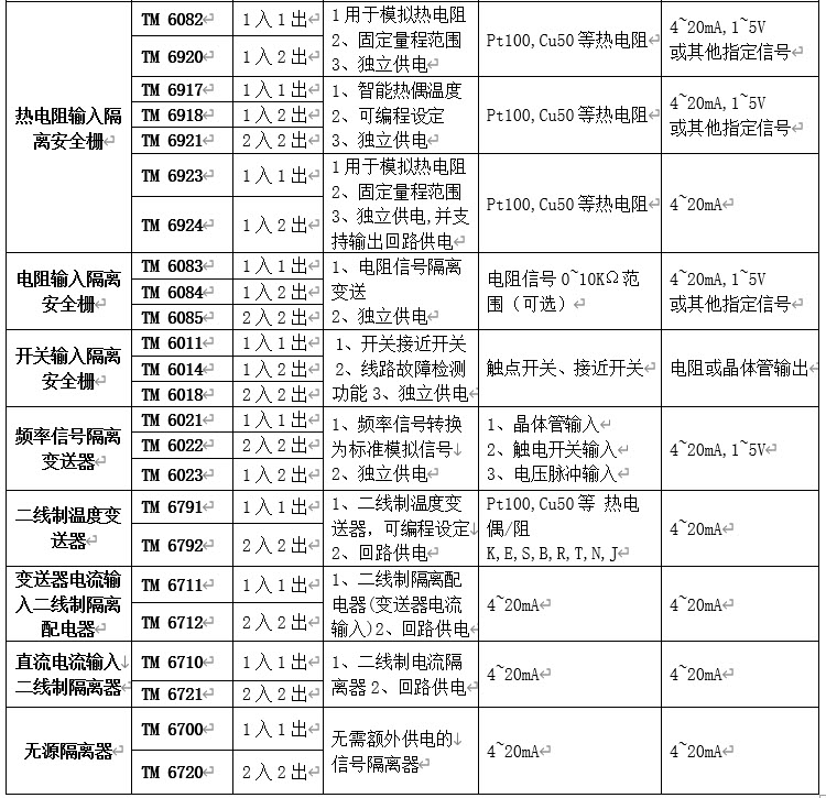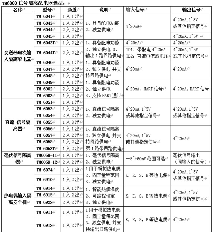 TM 6000系列产品是我公司开发的适合于非防爆领域应用,用于连接工业现场仪表与控制室之间的电气接口设备。它通过电源-输入 - 输出之间的可靠隔离,有效解决工业自动化控制系统现场干扰问题,保证系统的稳定性和可靠运行。TM6000 系列产品具备多种类型规格可供选择,基本满足自控系统中各种信号的隔离、配电、转换、分配、报警设定等功能要求。