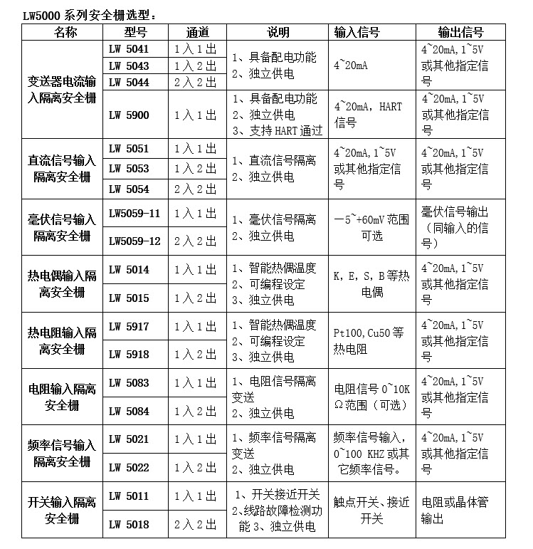 LW系列隔离器安全栅,将工业现场的电流信号,热阻/热偶温度信号以及开关量信号从危险区隔离传送到安全区,电源/输入/输出之间完全隔离 产品是依据国家标准GB3836.1 2010《爆炸性环境 第1部分: 设备通用要求》、GB3836.4 2010《爆炸性环境第4部分: 由本质安全型“ i ”保护的设备》设计的产品。是连接工业现场仪表与控制室仪表之间的本质安全关联设备。除此之外,安全栅还将电流、电压、电阻、电偶、频率等信号进行转换和分配,也可以给现场仪表提供配电电源和将控制系统输出信号输送到调节阀等仪表,满足了工业自动化控制系。
