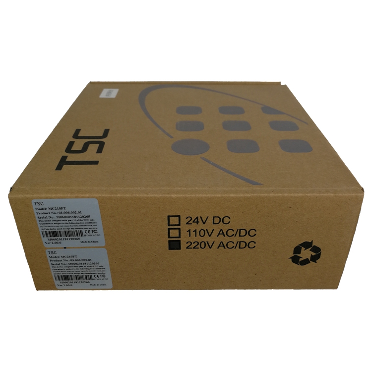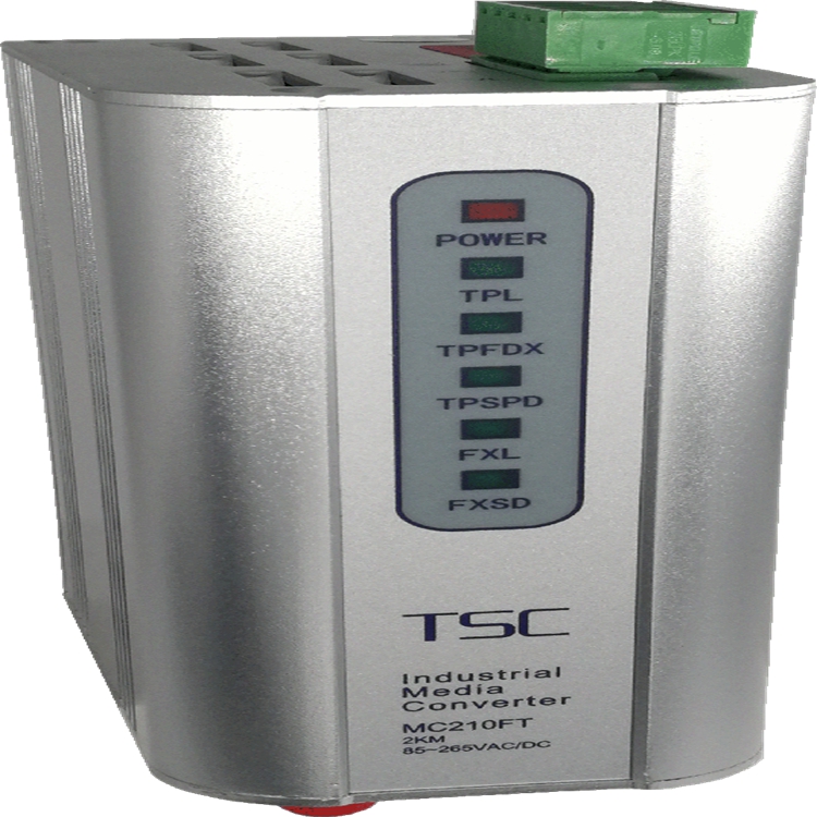TSC™ MC210系列工业级光电介质转换器是专门用于工业环境下10/100Base-TX与100Base-FX之间进行数据通讯的物理层设备,MC210FT光纤转换器符合IEEE802.3/803.3u标准,转换速率高达100M,支持全/半双工自动协商功能,高强度金属外壳结构能够屏蔽电磁干扰并且抗振动耐冲击,IP30级别防护等级,-40℃~85℃宽工作温度,确保MC210FT在严苛的工业现场工作良好,可选24VDC;、110V AC/DC;、220V AC/DC;等多种电源输入,工业化设计的端子电源输入,采用标准工业导轨安装方式,方便工业现场安装使用。