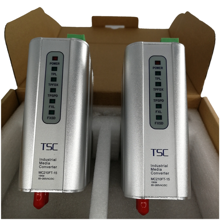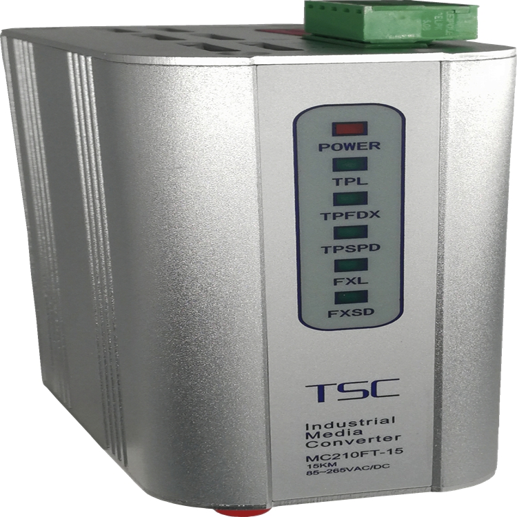 TSC™ MC210系列工业级光电介质转换器是专门用于工业环境下10/100Base-TX与100Base-FX之间进行数据通讯的物理层设备,MC210FT光纤转换器符合IEEE802.3/803.3u标准,转换速率高达100M,支持全/半双工自动协商功能,高强度金属外壳结构能够屏蔽电磁干扰并且抗振动耐冲击,IP30级别防护等级,-40℃~85℃宽工作温度,确保MC210FT在严苛的工业现场工作良好,可选24VDC;、110V AC/DC;、220V AC/DC;等多种电源输入,工业化设计的端子电源输入,采用标准工业导轨安装方式,方便工业现场安装使用。