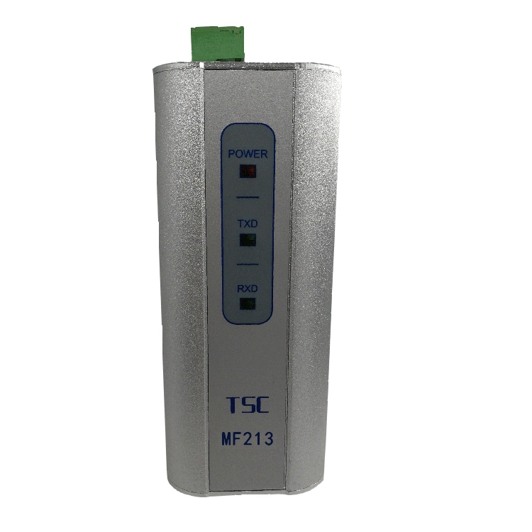 MF213     1个RS-485串口(工业端子模式),1个百兆(多模,2公里,ST)光口,18~36VDC,卡轨式工业级串口光纤收发器